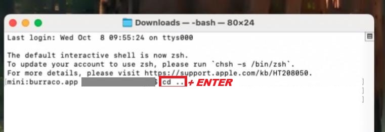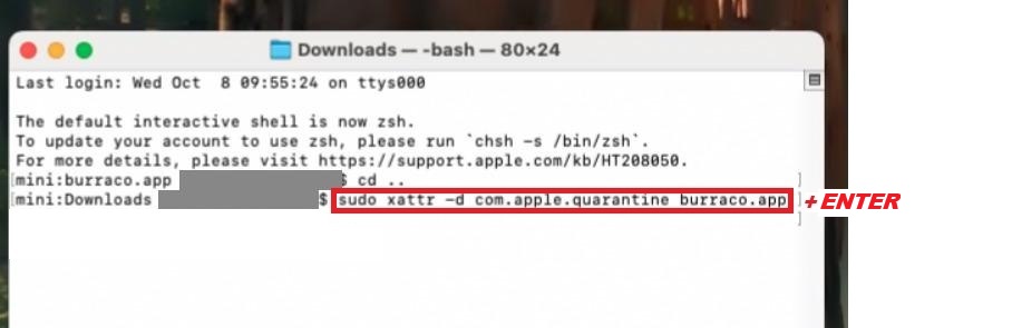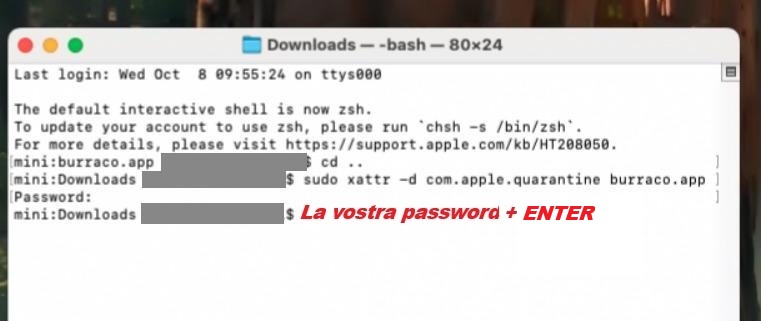 Now you will have to type sudo xattr -d com.apple.quarantine burraco.app and press ENTER, as shown in the following image