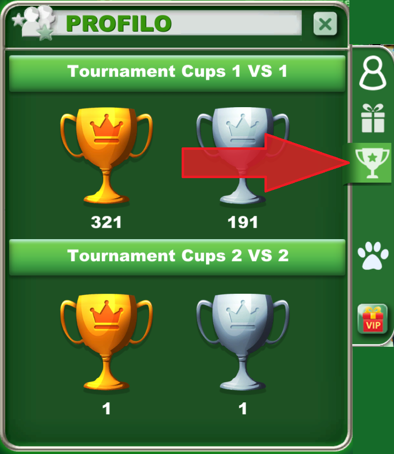 There are two types of cups: gold and silver; gold cups are earned by winning tournaments, while silver cups are earned by finishing in 2nd place.